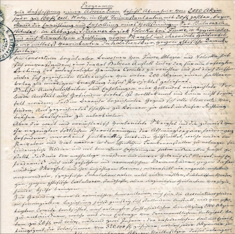 Scheitert an der Wiener Bürokratie: Georg Mathias Šporers visionäres „Programm“ aus dem Jahre 1872 zur Errichtung einer „Balnear und Inhalations Heilanstalt“ in Abbazia.