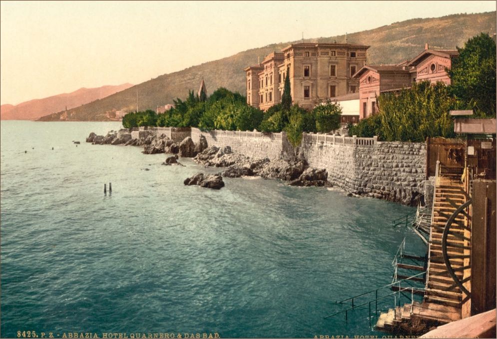 Erstes Südbahnhotel in Abbazia: das Hotel Quarnero. Photochromdruck, um 1890.