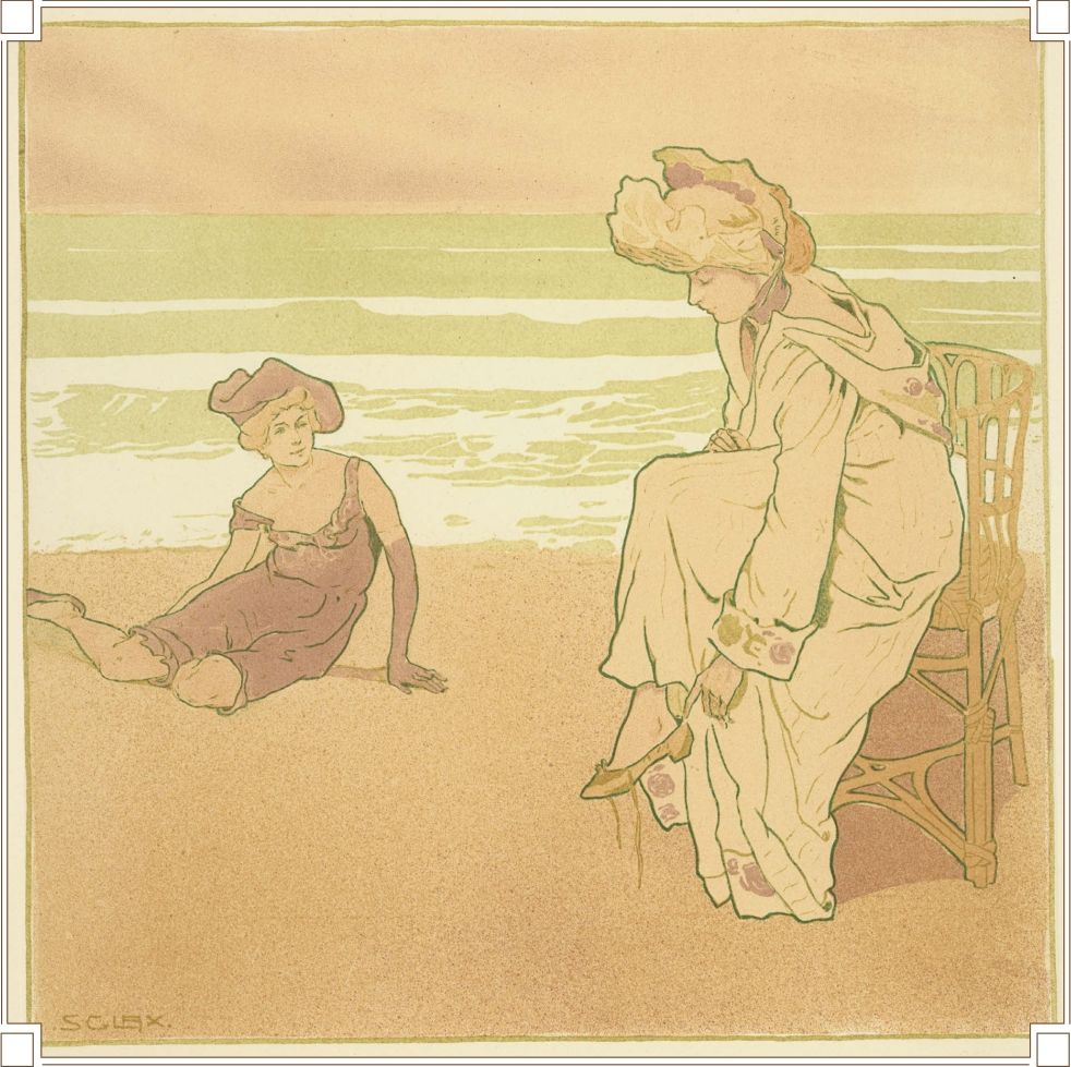 Am Strand. Algraphie von Stephanie Glax aus dem Zyklus „Der Tag einer Dame“, geschaffen 1900 während ihres letzten Studienjahrs an der Kunstgewerbeschule in Wien.