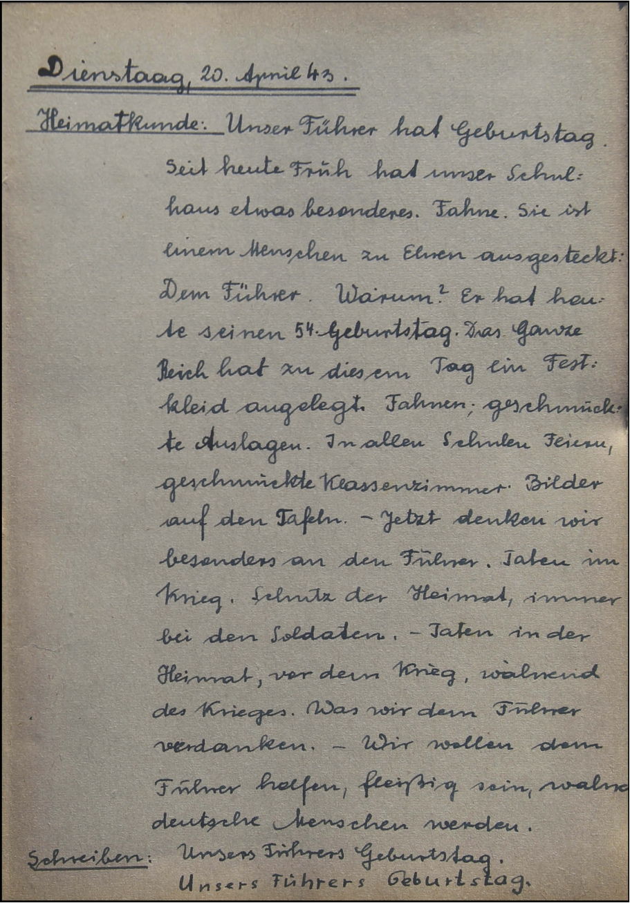 Eintragung einer Lehrerin zum „Führergeburtstag“ in ihrem Unterrichtsbuch, 20. April 1943.