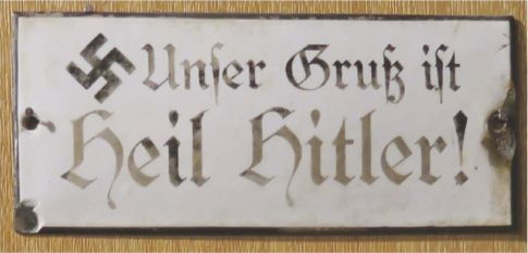 Grüßens gilt nicht mehr: emailliertes Metallschild, das den Eintretenden auf die neue Grußformel verpflichtet.
