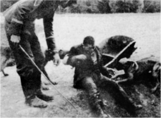 Blutiger Terror: Ein deutscher Wachmann hetzt seine beiden Hunde auf einen jüdischen Zwangsarbeiter.