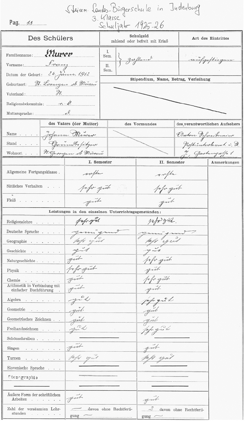 Franz kann die Erwartungen der Eltern auch durchaus erfüllen: Die drei Klassen Bürgerschule absolviert er nach anfänglichen Schwierigkeiten mit ausgezeichneten Noten, auch wenn sein Fleiß durchwegs nur mit „gut“ beurteilt wird. Einzig in der „Deutschen Sprache“ kann er seinen Lehrer nicht überzeugen, ein „Genügend“ verunziert das ansonsten hervorragende Abschlusszeugnis vom Juni 1926. In drei Schuljahren versäumt der Schüler Franz Murer insgesamt nur 4 Unterrichtsstunden, wie es sich gehört mit „Rechtfertigung“, sein „sittliches Verhalten“ wird ohne Ausnahme mit „sehr gut“ gewürdigt. Das Haus Gartengasse 1 liegt in unmittelbarer Nähe des Stadtzentrums von Judenburg und hier, am Hauptplatz, erlebt er zweifellos so manchen Aufmarsch und so manche Demonstration politischer Gruppierungen mit, vor allem des Steirischen Heimatschutzes, dessen Gründer Walter Pfrimer Rechtsanwalt in Judenburg ist, vielleicht auch schon der „Hakenkreuzler“ – nach dem „Anschluss“ wird das NS-Regime dafür sorgen, dass die Jüdische Gemeinde der alten Bürger- und Arbeiterstadt Judenburg zur Gänze vernichtet wird. Franz Murer macht hier erste Bekanntschaft mit Militarisierung und zunehmender Gewalt, rassistische und antisemitische Parolen werden zu vertrauten Alltagsbegleitern des Jugendlichen.
