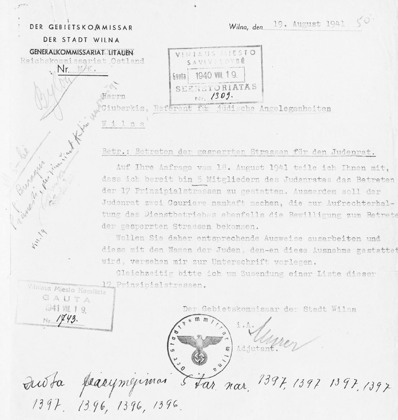 Adjutant Franz Murer ist gnädig: Er gestattet den Mitgliedern des Judenrats das Betreten von 17 „Prinzipalstraßen“ (LCVA, R-643, ap 3, b 300, Bl. 50).