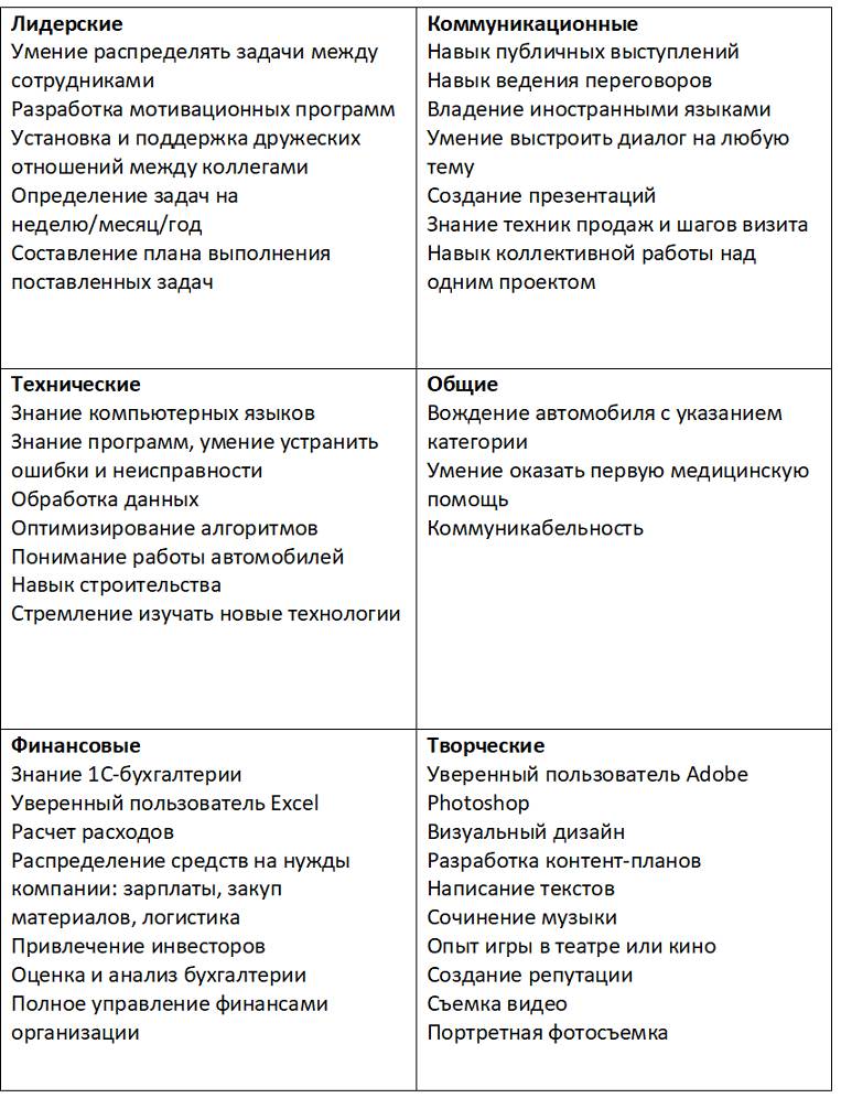 Подробнее об этом мы поговорим позже, а пока попробуйте сформулировать, какие навыки важны для вашей профессии. Я предлагаю следующую таблицу – в ней все разделено по категориям. Не стесняйтесь добавить что-то свое.