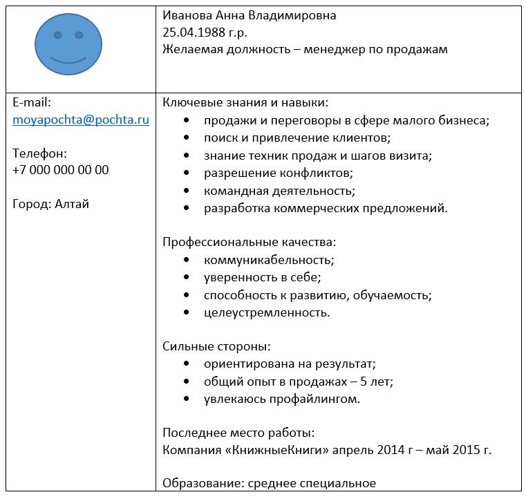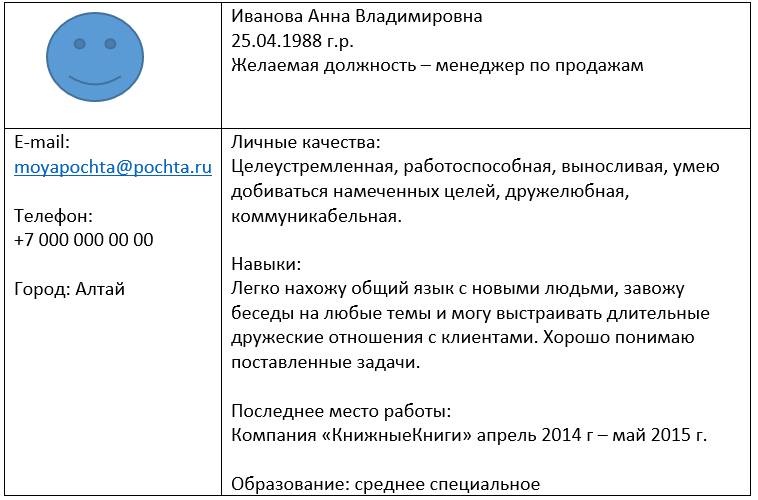 Аня искала работу менеджера по продажам. Последние пять лет она была в декрете – достаточно большой перерыв. И чтобы компенсировать отсутствие работы в резюме на протяжении длительного времени, Аня решила сделать акцент на достижениях и навыках. В целом подход правильный. Вот что получилось: