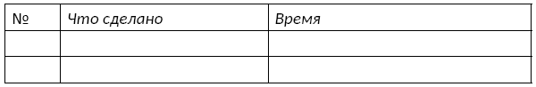 В конце рабочего дня посвятите пять или десять минут заполнению таблички. Записывайте конкретные задачи, которые вы ставили перед собой и выполнили сегодня, и сколько времени у вас заняло каждое дело.