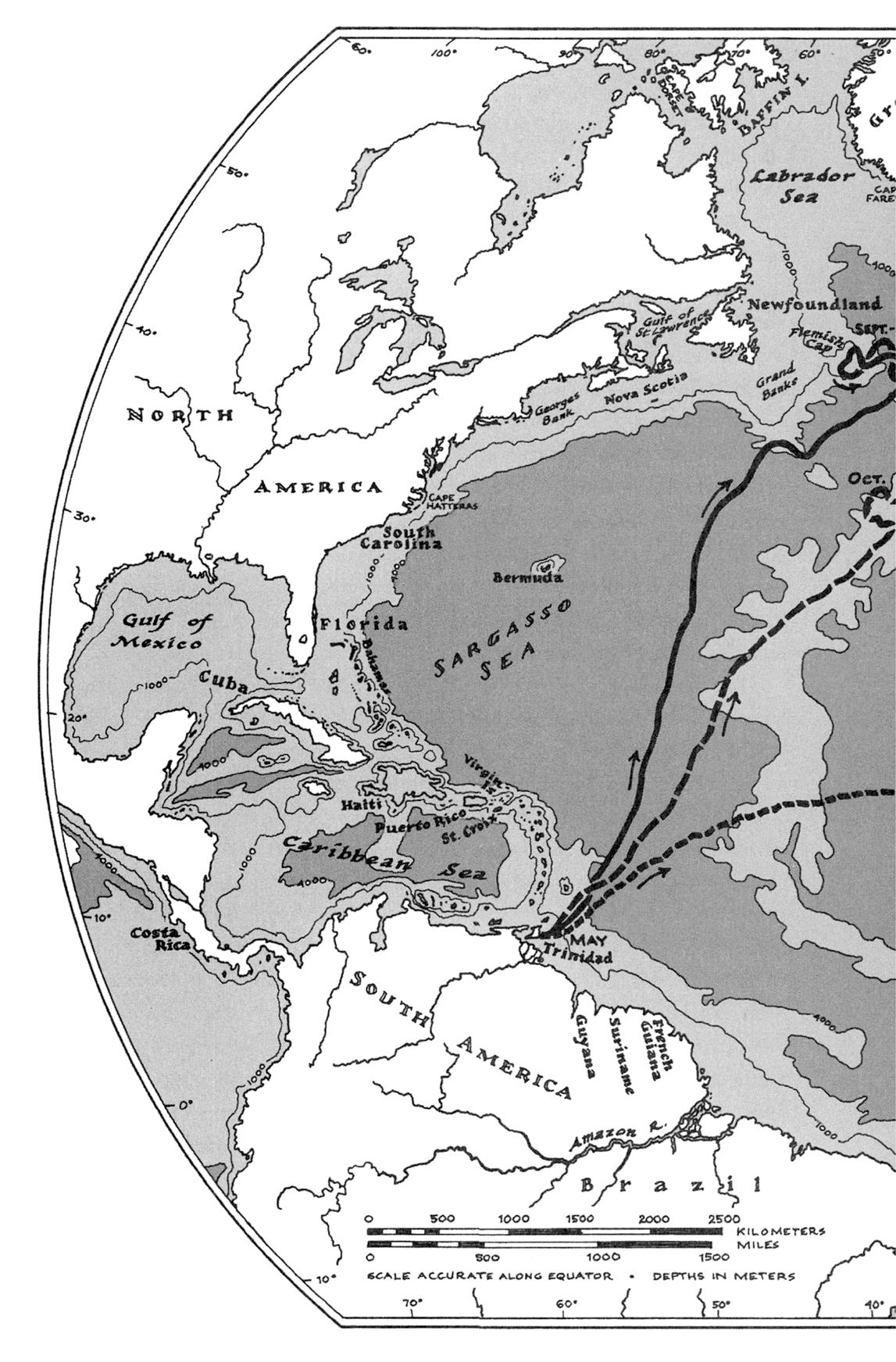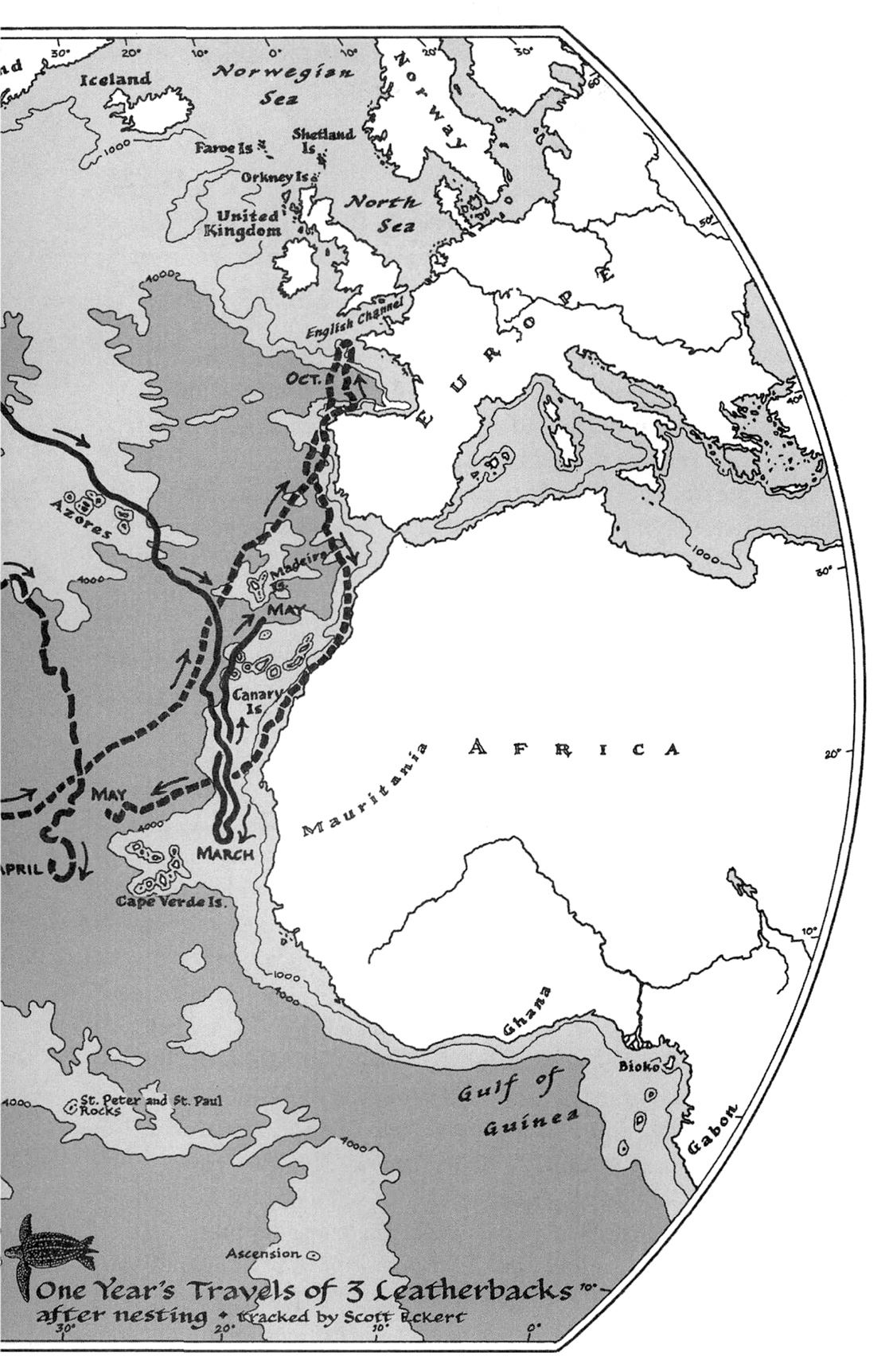 – Так интересно посмотреть, куда она поплывет, – говорит Скотт. – Я встречал совершенно потрясающие маршруты. Одна поплыла от банки Флемиш-Кап прямо на Канарские острова. Три тысячи километров по открытому океану! Если приложить линейку к ее маршруту на карте, вы сразу поймете, что лучше и придумать было нельзя, даже используя спутниковую связь и GPS. Я просто теряю голову, когда смотрю на путешествия, которые проделывают эти черепахи! А потом думаю: только бы им не попасть в сети у берегов Исландии или Африки.