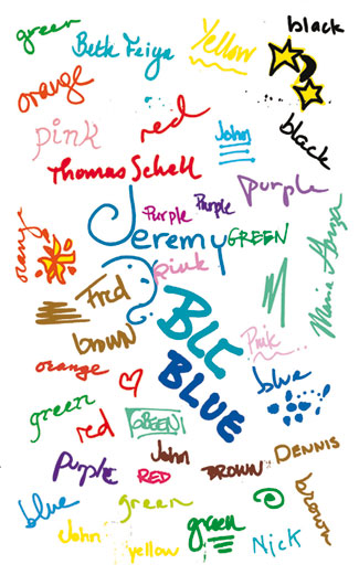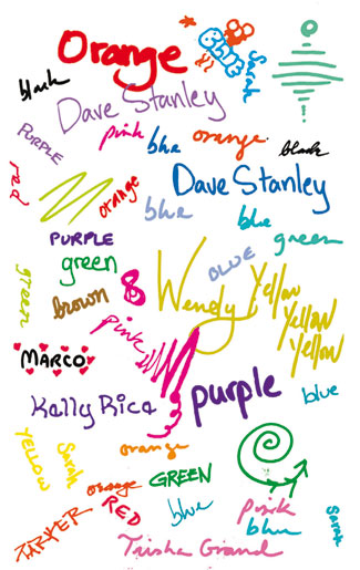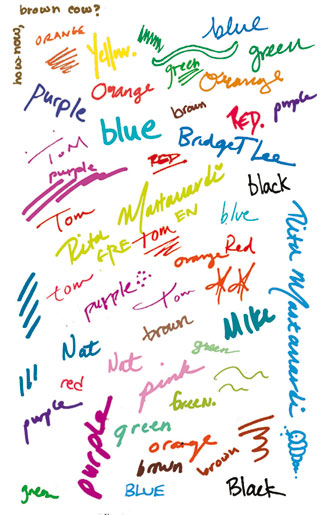 «Видишь, – сказала она, – большинство людей пишут название цвета той ручки, которую они пробуют». – «Почему?» – «Откуда я знаю. Небось какая-нибудь психологическая заморочка». – «Психологическая значит умственная?» – «Практически». Я над этим задумался, и мне было озарение, что если бы я захотел попробовать синюю ручку, то, скорее всего, написал бы слово «синий». «Не так-то просто сделать, как твой папа, – написать название одного цвета другим цветом. Не увсех получится». – «Правда?» – «А это еще труднее», – сказала она и написала что-то на следующей странице блокнота, и попросила меня прочесть это вслух. Она была права: прочесть оказалось еще труднее, потому что одна часть меня хотела произнести название цвета, а другая часть меня хотела произнести то, что им было написано. В итоге я не произнес ничего.