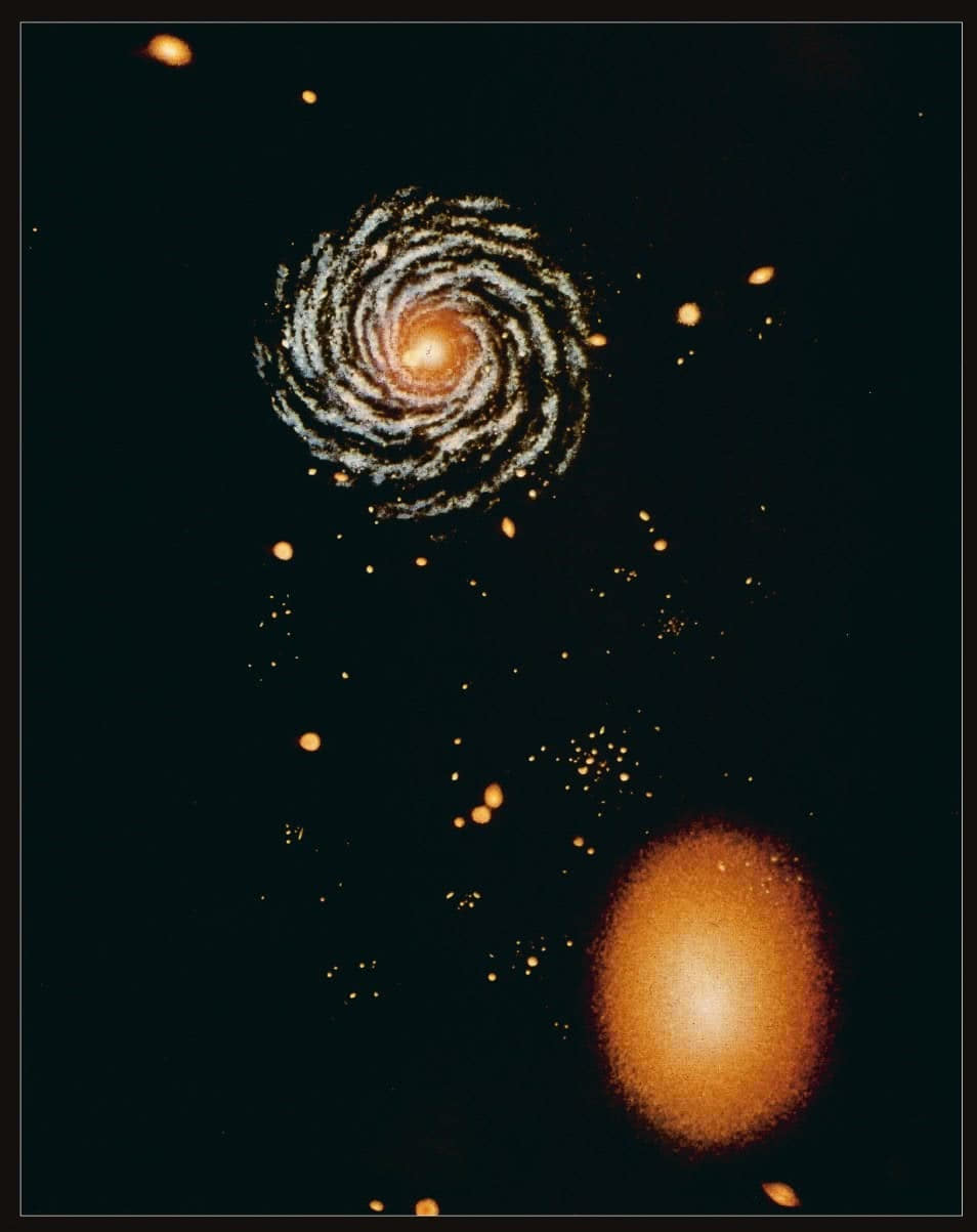 Млечный Путь, видимый из точки, немного приподнятой над плоскостью его спиральных рукавов (их голубой цвет объясняется наличием горячих молодых звезд). Вдали видно ядро галактики, состоящее из более старых красноватых звезд.