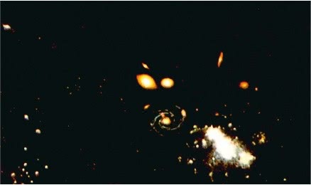 Заняв наблюдательный пост в межгалактическом пространстве, мы увидели бы россыпь бесчисленных слабых волокон света, напоминающих морскую пену на волнах Космоса. Это галактики. Некоторые из них одинокие странники, но большинство обретается в составе общин – звездных скоплений и, сбившись в кучу, бесконечно дрейфуют среди величественной темноты Космоса. Перед нами Космос в самом крупном из известных масштабов. Мы в царстве туманностей, в 8 млрд световых лет от Земли, на полпути к границам известной нам Вселенной.
