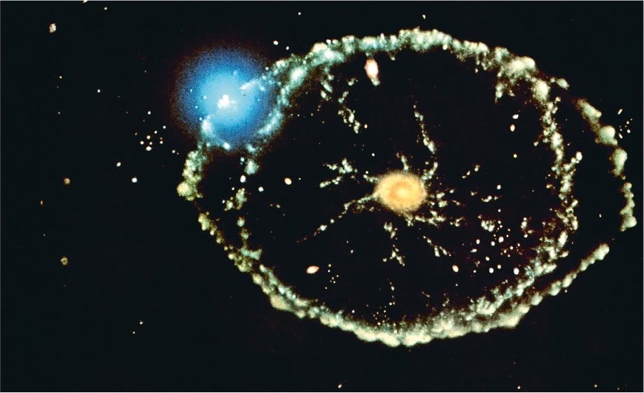Редкая кольцеобразная галактика, одна из звезд которой взорвалась как сверхновая и сияет голубым светом.
