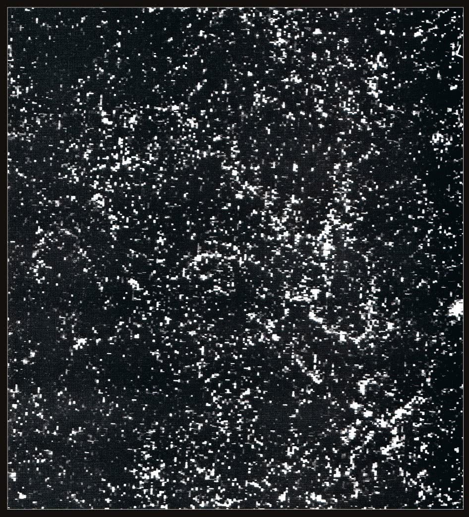 Крупномасштабная текстура Космоса: небольшой фрагмент карты, охватывающей миллионы ярчайших галактик на расстоянии до миллиарда световых лет от Земли. Каждый маленький квадратик – это галактика, содержащая миллиарды звезд. Карта построена по результатам телескопического обзора, который Дональд Шейн и Карл Виртанен из Ликской обсерватории Калифорнийского университета составляли 12 лет.