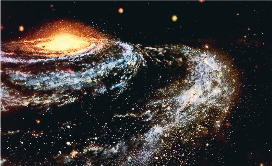 Но сейчас наше путешествие приводит нас к Местной группе галактик, как называют это земные астрономы. Достигая в поперечнике нескольких миллионов световых лет, она включает в себя около 20 галактик[13]. Это довольно разбросанное, бедное и малозаметное скопление. Одна из его галактик, М31, видна с Земли в созвездии Андромеды. Подобно другим спиральным галактикам, она представляет собой огромный диск из звезд, газа и пыли. М31 имеет два маленьких спутника[14] – две карликовые эллиптические галактики, связанные с ней гравитационным притяжением в силу того же физического закона, который стремится удержать меня в кресле. Во всем Космосе действуют одни и те же законы природы. А мы с вами находимся сейчас в 2 млн световых лет от дома.