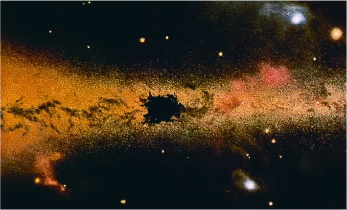 Туманность Ориона вблизи. Под воздействием излучения горячих звезд ее газ светится разными цветами. Часть туманности заслонена поглощающей свет пылью. Туманность Ориона видна с Земли невооруженным глазом.