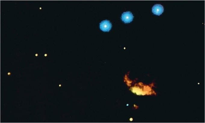 Обратная, невидимая с Земли сторона туманности Ориона. Три голубые звезды – это пояс Ориона, привычного нам созвездия земного неба.