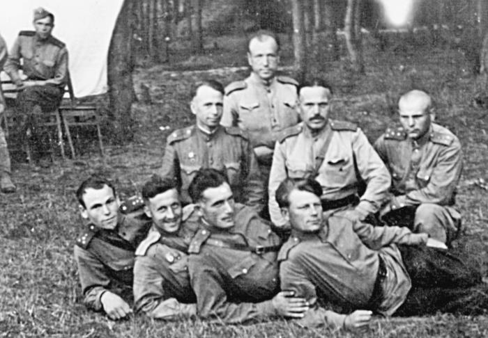 Украинский фронт, Львовская область, село Луковец, июль 1944 г. Совещание командного состава дивизии. В третьем ряду – лейтенант Сахончик, во втором ряду крайний справа – капитан Мостовой.