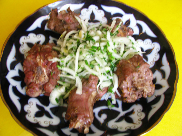 Пламя должно быть средним, чтобы куски мяса не обуглились сверху, и не остались внутри сырыми. Многие, как правило, предпочитают даже не солить: солят и перчат когда закуска уже на «тарелочке с голубой каёмочкой». Некоторые обжаривают в казане лук. Я же, предпочитаю, присыпать свежим нашинкованным лучком, сбрызнув его самую малость столовым уксусом, посолив, поперчив, украсив веточками кинзы и…