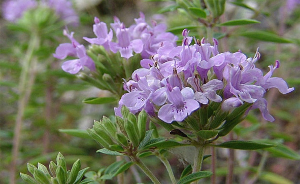 Цветки мелкие, розовато-лиловые, в немногочисленных ложных мутовках, очень часто скученные в верхней части стебля и ветвей, сидячие или на цветоножках. Чашечка удлинённая, узко трубчатая с 13 жилками, в зеве мохнатая. Венчик небольшой с едва выдающейся расширенной кверху трубкой без кольца волосков.