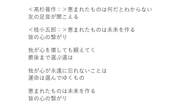 Город ЭдоНе замечает, что удар колокола провозгласил конец старого мира.Цветочная столицаСтрашится тех, кто высек на своём сердце «чистосердечную справедливость» и не знает сомнений.Утекает сквозь пальцыВремя знакомого мираНайдётся ли кто-то, кто сможет его остановить?Души последних самураевИщут что-то, на что можно и впредьОпереться.Прекрасная мостами НагасакиВлюблёна в сверкающее золото и звук паровых кораблей.Нагасаки держит у сердцаИ никогда не забудет мечты того времени и звук его шагов.<Сакамото Рёма:> «Чтобы что-нибудь получилось,На это нужно поставить жизнь.До последнего держись за свою надежду».<Нагаока Кэнкити:> «О друг, что коснулся моего сердца и ушёл первым,Подожди меня немного».Гордый город Симоносэки верит в надёжные катаны и новые пушки.Неустрашимый город Симоносэки привык к туберкулёзному кашлю и песням сямисэна.<Такасуги Синсаку:> «Благословлены?Я не знаю, чем. Чем я благословлён?Дорогого друга слышу звук шагов».<Кацура Когоро:> «Благословлены —Связью сердец всех тех,Кто создаёт будущее».Путь, который я выбираю до последнего мгновения,И ломает, и закаливает моё сердце.Моё сердце никогда не забудет, что судьба – это то, что выбирают.Благословлены —Связью сердец всех тех, кто создаёт будущее.