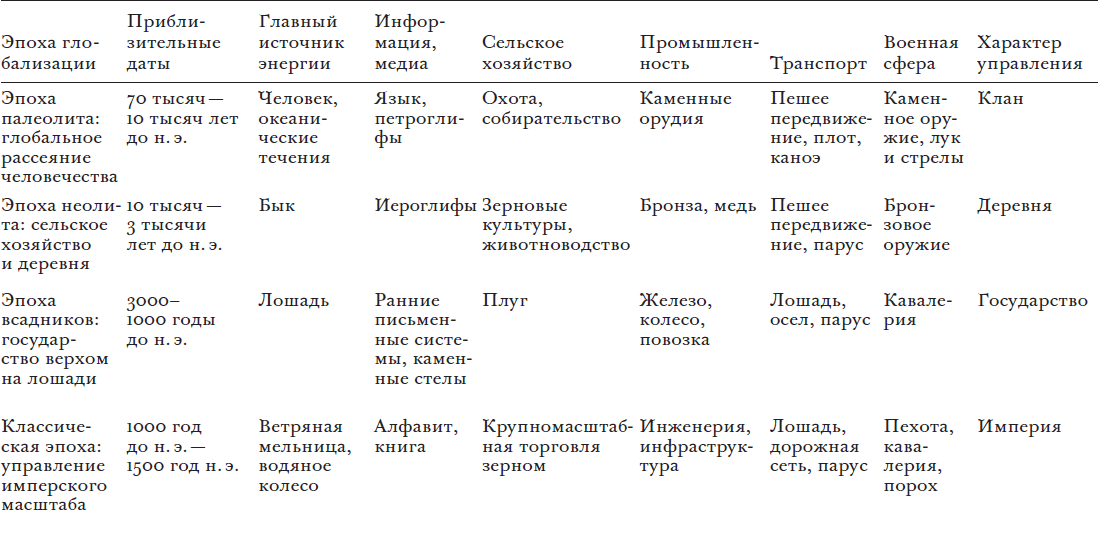 Таким образом, историю глобализации можно рассматривать как ряд трансформаций, которые вели к увеличению масштаба. В эпоху палеолита люди современного типа увеличивали масштаб человеческого расселения, мигрируя по всему миру, хотя большинство индивидов проводили свою жизнь в рамках групп численностью от 30 до 50 человек[5]. В эпоху неолита население планеты выросло примерно в 22 раза, с 2 млн за 10 тысяч лет до н. э. до порядка 45 млн в 3000 году до н. э., а люди жили в деревнях, насчитывавших несколько сотен человек. В эпоху всадников мировое население выросло примерно с 45 млн в 3000 году до н. э. до 115 млн в 1000 году н. э., причем подавляющее большинство проживало в пределах все более взаимосвязанной полосы, протянувшейся с востока на запад Евразии. Теперь человечество впервые было организовано в виде государств с отчетливыми границами, а не просто рассеянных деревень. В классическую эпоху численность человеческой популяции значительно выросла – от 188 млн в 1 году до 295 млн к 1000 году и 390 млн к 1400 году. Все больше людей жило в многонациональных многоконфессиональных империях, которые располагались на пространствах суши, таких как Римская, Ханьская, Персидская, Византийская и Монгольская империи, империи Маурьев и Омейядов и другие. Эти империи не только воевали, но и торговали друг с другом на дальние расстояния.