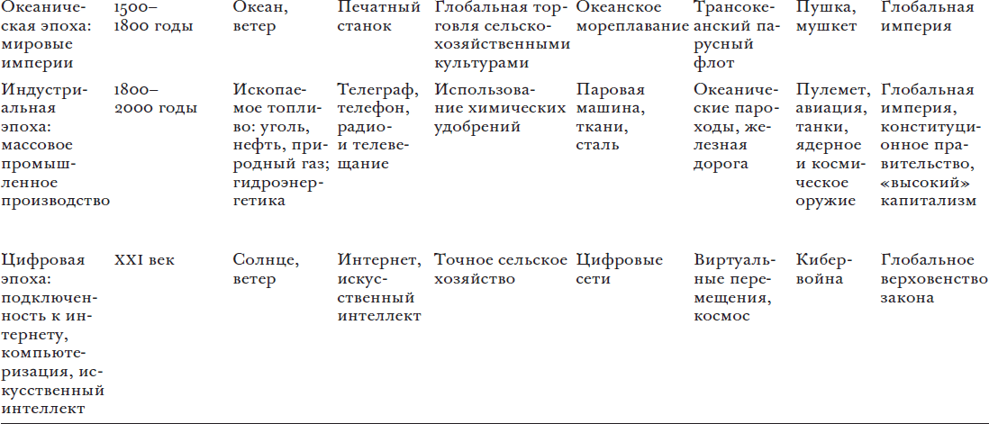 Вместе с путешествиями Христофора Колумба и Васко да Гамы, когда произошел переход к океанической эпохе, масштаб увеличился вновь, на сей раз до глобального охвата, который заново связал Старый и Новый Свет с помощью океанского мореплавания. Мировое население вновь резко увеличилось благодаря трансокеанскому обмену разнообразными продуктами питания (например, из Старого Света на Американский континент была завезена пшеница, а из Америки в Старый Свет попала кукуруза), что обусловило чрезвычайное увеличение производства продовольствия и численности населения. К 1800 году население планеты находилось на уровне 990 млн человек. В индустриальную эпоху глобальные взаимосвязи решительно усилились благодаря железным дорогам, океанским пароходам, автомобилям, авиации, телеграфу, телефону, спутниковой связи и, наконец, интернету, а численность мирового населения резко выросла. Впервые в человеческой истории появились подлинно гегемонистские политические силы, чье могущество распространялось на бо́льшую часть земного шара – сначала это была Британия, а затем, после Второй мировой войны, Соединенные Штаты. С переходом к цифровой эпохе глобальное могущество вновь трансформируется, а интенсивность всемирных взаимодействий продолжает нарастать, на сей раз благодаря всепроникающим, происходящим в режиме реального времени потокам информации, которые распространяются по планете.