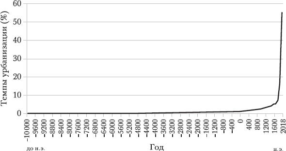 РИС. 1.2. Глобальный уровень урбанизации (10 тысяч лет до н. э. – настоящее время), %