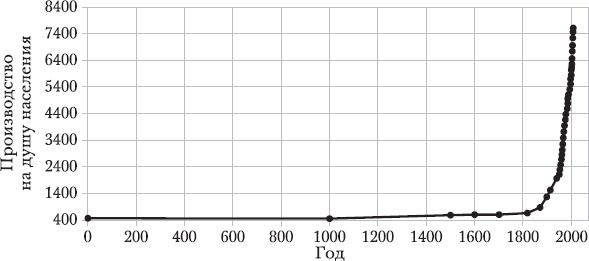 Предпринятые Мэддисоном оценки глобального производства на душу населения в промежутке от 1 года до 2008 года представлены на рис. 1.3. Здесь мы вновь видим ту же модель, что и в случае с населением и урбанизацией. До 1500 года ощутимого изменения мирового производства на душу населения не происходило: ежегодный рост составлял всего 0,01 %. Между 1500 и 1820 годами происходило незначительное увеличение производства – годовые темпы роста были равны 0,05 %. Затем, вместе с началом индустриализации, произошел решительный подъем: между 1820 и 2000 годами средние темпы роста составляли 1,3 % в год. За эти 180 лет объем мирового производства на душу населения увеличился примерно в 11 раз, что привело к столь же впечатляющему сокращению уровня крайней бедности в глобальном масштабе – примерно с 90 % в 1820 году до порядка 10 % в 2015 году[4].
