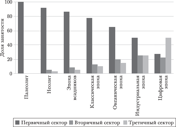 РИС. 1.4. Оценка доли занятости в основных секторах экономики в ходе семи эпох глобализации, %
