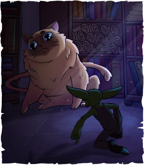 Кот хотел уже подойти ближе, но вдруг какой-то звук отвлёк его. Гремлин не слышал этого звука, но решил, что это потому, что слух у котов намного лучше. Кот отправился на поиски источника звука. Расстроенный гремлин поплёлся следом. Так они прошли метра два: кот крался в направлении выхода из библиотеки, а гремлин крался за ним. Гремлин даже не подозревал, что насторожившийся кот сейчас охотится вовсе не за кем-то там в темноте…