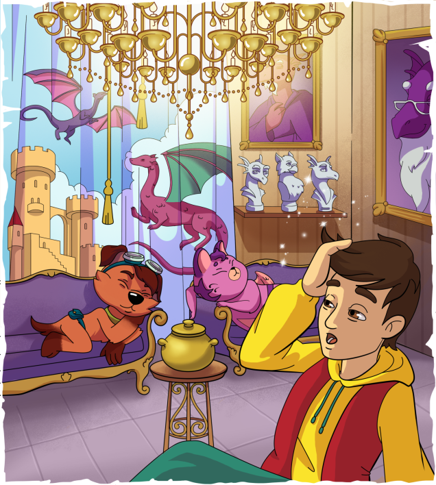 Открыв глаза, Саша обнаружил себя в богато убранной комнате. Огромная люстра диаметром примерно в пять лабрадоров горела тысячью огней, ярко освещая интерьер. Картины на стенах двигались как живые, бюсты на полках с любопытством рассматривали оказавшихся в центре комнаты пришельцев. Тяжёлые шторы, на которых была вышита история мира, были задёрнуты, защищая посетителей от посторонних глаз.