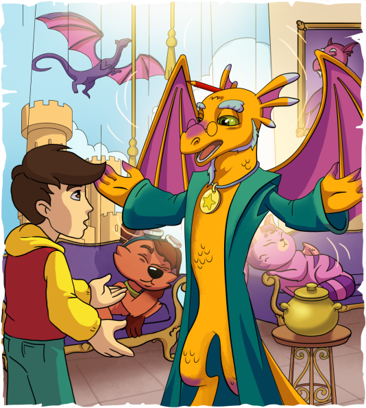 Никого не было видно. Картины беззвучно светились на стенах, скульптуры с лёгкой улыбкой смотрели на Сашу и молчали. Кроме него, Астро и Луны, а также глупого глиняного горшка, в комнате никого не было. Саша было уже подумал, что голос ему просто померещился, но тут штора зашевелилась, один из драконов, изображённых на ней, вылетел в комнату и стал быстро увеличиваться в размерах, пока не превратился… в профессора Новуса Визворда.