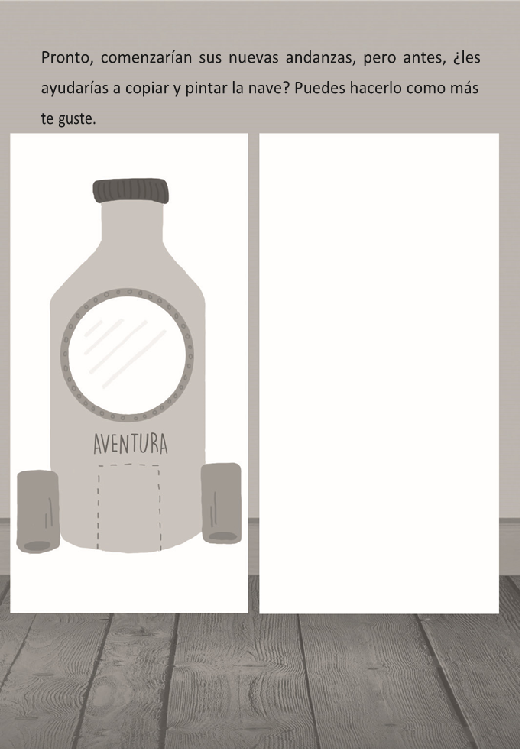 Să faci o navă spațială este mai ușor decât pare dacă îți folosești imaginația. Alex și Alvaro au luat o sticlă de lapte de plastic goală pentru a face nava și au folosit două role de hârtie igienică drept motoare. Pentru a intra în navă, au făcut o ușă mare prin care să poată intra orice șoarece, chiar dacă era mai grăsuț. De asemenea, au decis să facă o fereastră, prin care să se poată uita când zburau.