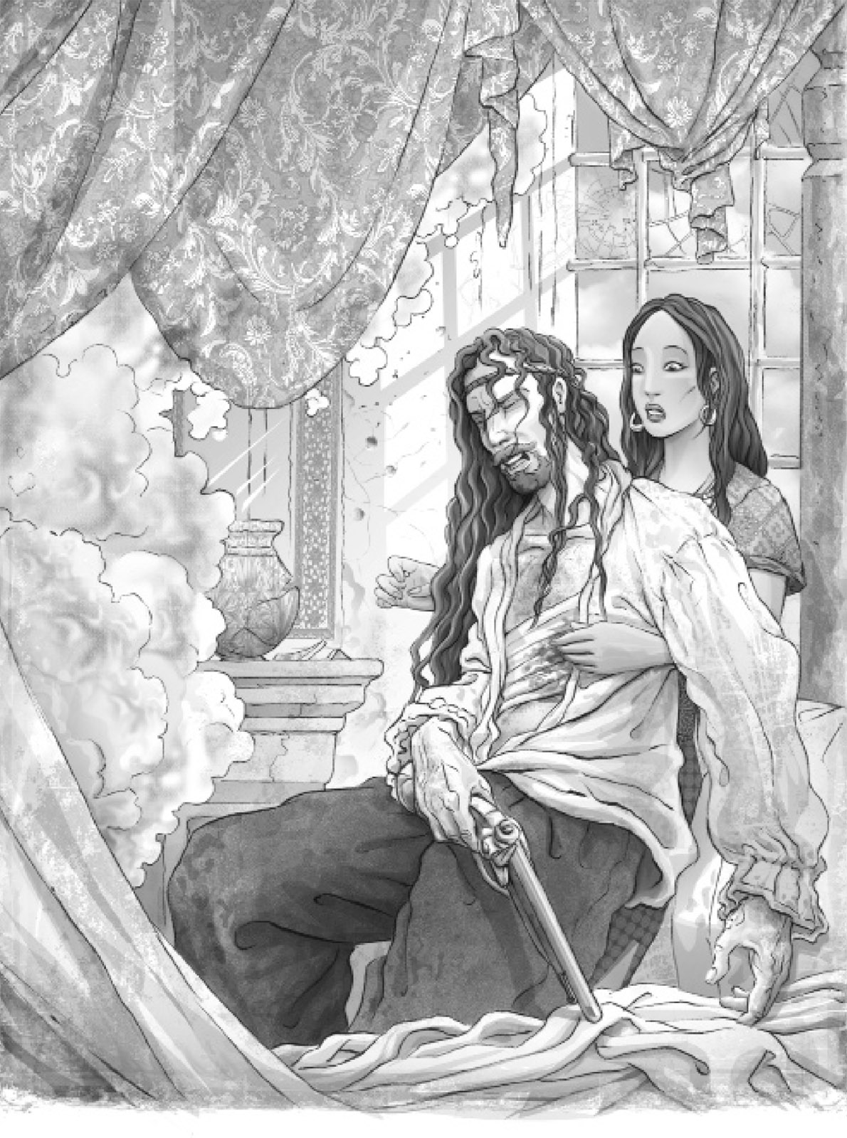 Se separó de la ventana y, apoyándose en la joven, volvió a acostarse, sin apartar de sí las pistolas ni la espada.