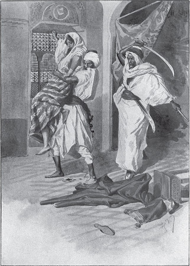 Эль-Хагар не был трусом. Не зная, сколько противников может ожидать его внутри, он поспешил на помощь девушке. Миновав две комнаты, в третьей он увидел Эль-Мелаха, тащившего брыкающуюся Эстер. Мавр все понял. Он взялся было за револьвер, но побоялся ранить Эстер. Тогда рубанул ятаганом, вонзив клинок между лопатками предателя.