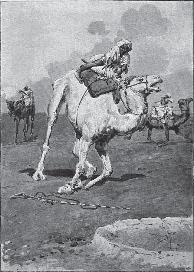 Увидев, что пал их лучший верблюд, разбойники негодующе завопили и принялись понапрасну палить из мушкетов. Поняв, что никто из троих противников даже не задет, они погнали мехари вперед, намереваясь подобраться ближе.