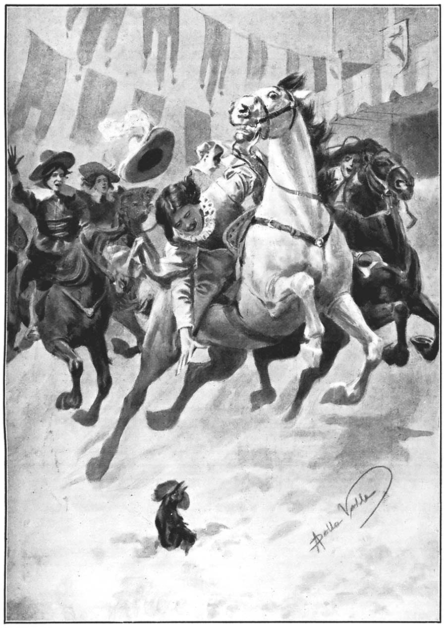 Граф гарцевал так великолепно, что вызвал у зрителей настоящий взрыв энтузиазма. И мужчины и женщины отчаянно били в ладоши, когда он пролетал мимо, склонившись к шее скакуна и покачивая своим длиннющим красным пером. Так молодой всадник на ураганной скорости подскакал к первому петуху. Он наклонился к земле, крепко держась одной рукой за шею коня, и, ловкий, как арабский наездник, ухватил птицу, выдернул ее из ямки и торжественно взметнул вверх.
