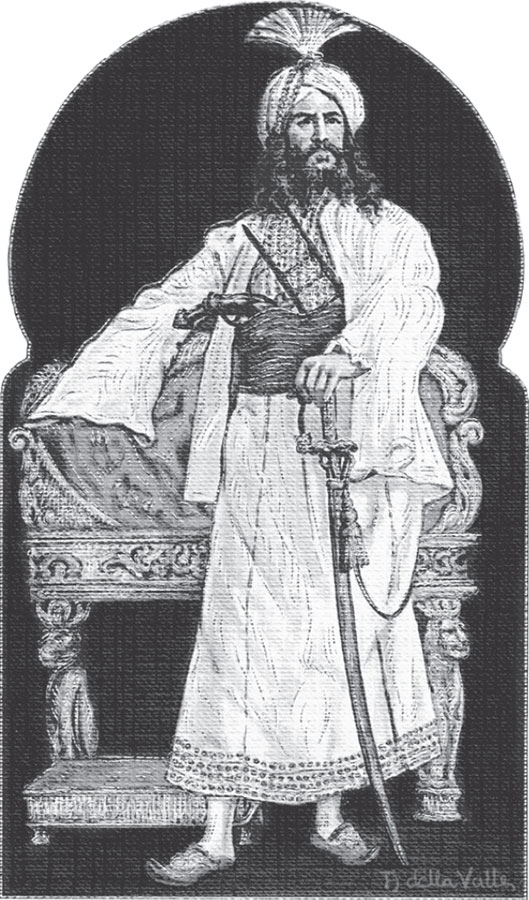 Одет он был как раджа: в голубой шелковый кафтан, расшитый серебром, белую шелковую рубашку, широкие, на турецкий манер, шаровары, черный бархатный кушак с золотой бахромой, высокие сапоги красного сафьяна с приподнятыми носками. Вооружен – английским двуствольным карабином. За пояс были заткнуты два пистоля, в ножнах пряталась короткая сабля, на рукояти которой поблескивал бриллиант размером с лесной орех.