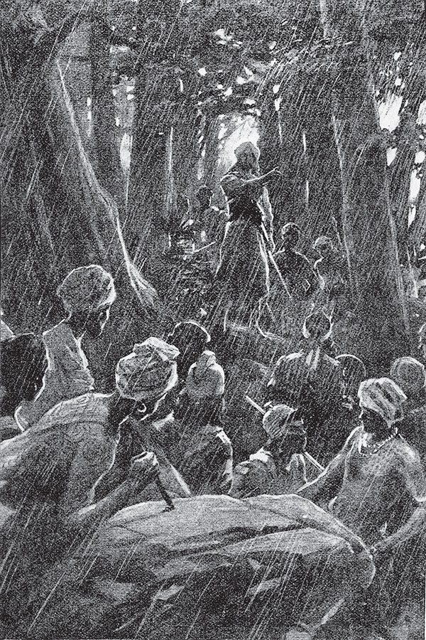 Отряд под предводительством Сандокана в полном молчании двинулся через заросли. Дождь унялся, но гром продолжал греметь. Сверкали молнии, порывы ветра то и дело с воем обрушивались на джунгли, ломая ветви, обрывая листву и плоды. Люди бесшумно скользили от одного толстого ствола к другому. Минут через десять раздалась команда: