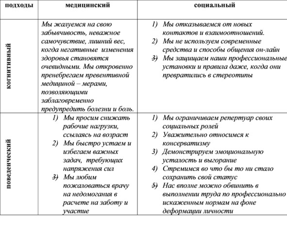 Вот, как я попробовала классифицировать самые яркие, на мой взгляд, наши с вами провокации эйджизма (рис. 1). Для классификации я соединила 4 типовых подхода в исследованиях «эйджизма». Первый – с точки зрения медицинской, второй – с точки зрения социальной. Проще говоря, изменения духа и тела. А третье и четвертое изменения связаны с тем, как меняется наше мышление и познание (когнитивная сторона изменений) и как меняется наше поведение (поведенческая и деятельностная сторона возрастных изменений у 55-60-летних людей).