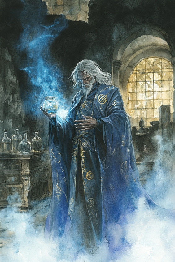 Серая мантия, истёртая временем и покрытая символами древней алхимической гильдии, вспыхнула ослепительным синим светом. Её ткань, казавшаяся прежде грубой и тяжёлой, вдруг ожила, заструилась мягкими волнами, будто шёлк, сотканный из самого неба. Мощь пробежала по её изгибам, переливаясь в узорах, которые, казалось, пульсировали в такт биению сердца. Верховные магистры, давным-давно канувшие в бездну, несомненно, гордились бы им.