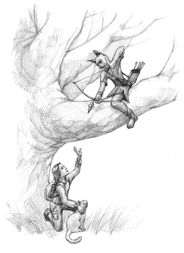 После того, как лук тоже быстро спрятался за узкими мохнатыми плечами, она спрыгнула вниз. Оказавшись прямо перед незваными гостями, уперла руки в бока и стала откровенно разглядывать всех, кто к ней пожаловал. Прищуренный взгляд по очереди скакал то на кота, то на девочку. Когда же перед ними из цепкой травы кубарем вывалился когтенок, она ничуть не удивилась, а только фыркнула в его сторону.