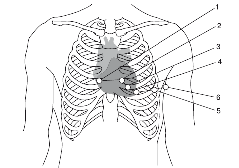 Рис. 2.1. Расположение шести грудных электродов при записи ЭКГ