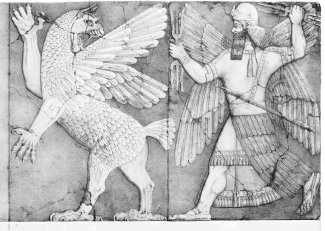 Мардук сражается с Тиамат. Рисунок рельефа из дворца Ашшурнацирапала в Кальху (Нимруд, современный Ирак). IX в. до н. э