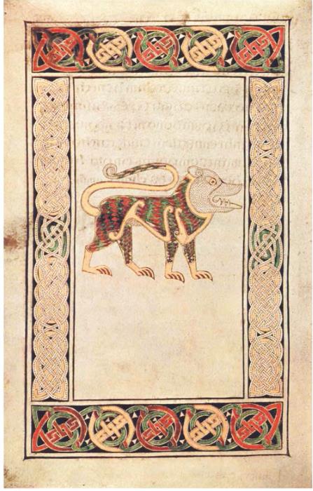Художественная традиция, которую принесли с собой варварские племена, не была привязана к античному понятию красоты, в ней отсутствовало стремление передавать вещи такими, какими их видит наш глаз: трехмерными и натуроподобными. В равной степени чуждым ей было и желание идеализировать образ. С началом Средних веков рождается другая эстетика, где на первый план выходит экспрессия, то есть заостренная выразительность художественного произведения. Глядя на изображение символа евангелиста Иоанна в Евангелии из Дарроу, созданном в VII веке, вероятно, в Англии, лишь с большим трудом можно узнать в нем льва. Современному зрителю он напомнит скорее сказочного хищника или, в крайнем случае, собаку. На миниатюре этот зубастый зверь с вытянутой мордой аккуратно обведен по контуру, а его туловище заполнено красно-зелеными ромбовидными сегментами. При абсолютно плоскостной трактовке и отсутствии пространственной глубины, изображение не лишено пленяющей декоративности и особого шарма. Змеевидный изгиб хвоста добавляет изящности этому необычному и, бесспорно, эффектному существу.