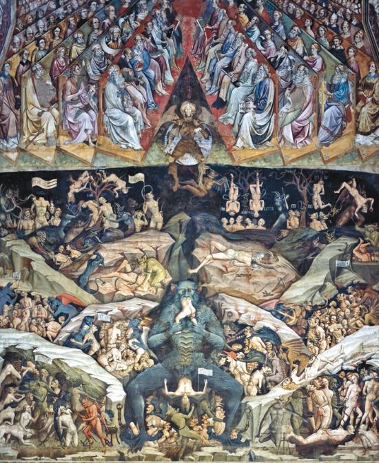 Главным источником сведений о конце времен стало «Откровение Иоанна Богослова» – книга ученика Иисуса Христа, вошедшая в состав Нового Завета. Другое ее название – «Апокалипсис» (от др. – греч. «раскрытие, откровение»). Текст Откровения полон загадочных и мистических предсказаний о конце времен. В нем описывается решающая битва Господа и Сатаны, во время которой ангелы сражаются с демонами и демоническими созданиями: драконами, змеями, гигантской саранчой. Там же присутствует и образ демонической женщины – Вавилонской блудницы, восседающей верхом на монстре. Эти жуткие описания умножали страх перед грядущим Апокалипсисом и рисовали в сознании средневековых людей ужасные картины мучений и страданий, которые обрушатся на человечество. Ажиотаж вокруг Второго пришествия и Страшного суда усиливался еще и оттого, что никто не знал, когда именно они свершатся. «Итак, бодрствуйте, потому что не знаете ни дня, ни часа, в который приидет Сын Человеческий» – так написано в Евангелии от Матфея (Мф 25:13). И если одни богословы не верили в возможность высчитать точную дату этого события, другие, напротив, скрупулезно высчитывали возможные даты. Средневековые художники и скульпторы, в свою очередь, выражали эсхатологические ожидания в ярких апокалиптических картинах, вкладывая в них все свое усердие и воображение. На фреске Джованни да Модены в базилике Сан-Петронио в Болонье (1410 г.) мы видим покрытого шерстью дьявола с огромной и омерзительной пастью, которая пожирает грешников. Второе, не менее безобразное дьявольское «лицо» находится на месте гениталий и исторгает тела ранее проглоченных нечестивцев. При этом выражение лица у того, кто побывал внутри дьявольской утробы, вызывает искреннее сочувствие и отчетливое нежелание оказаться на его месте.