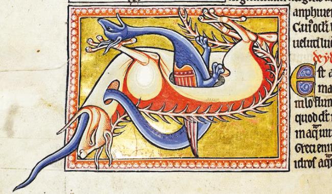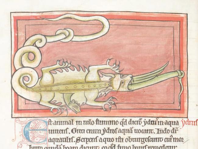 Но даже у самых свирепых чудовищ были свои враги. Заядлым противником крокодила был гидр (или гидрус). В бестиариях рассказывалось, что гидрус обитает в реке Нил и когда он видит спящего на берегу крокодила, то входит внутрь него через открытый рот. Чтобы ему легче было проскользнуть через крокодилью глотку в чрево, он сперва выкатывался в грязи. Согласно тексту бестиария, крокодил невзначай заглатывает живого гидруса, который, однако, не стремится задерживаться внутри и, разодрав крокодилу все внутренности, выходит из него наружу целым и невредимым. Момент проникновения гидруса в крокодила запечатлен на миниатюре бестиария из Британской библиотеки. А на миниатюре из Абердинского бестиария можно увидеть момент его «выхода» из крокодильего чрева. Само изображение гидруса в обоих примерах малопримечательно: вид у этого зверька довольно невзрачный, чем-то напоминает обычную змею. На его фоне крокодил выглядит гораздо более зловещим. Абердинский бестиарий – один из самых роскошно украшенных английских манускриптов XII века – приводит довольно подробное описание гидруса. Там он относится к разряду водяных змей, чем объясняется и его название (от древн. – греч. hydor – «вода»). Как сообщает нам бестиарий, те, кого укусит гидрус, распухают, и спасти их можно только с помощью бычьего навоза. Таким образом, можно предположить, что зверек представлял опасность и для человека.