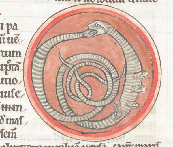 Еще один интересный пример символической интерпретации животного являет собой гадюка. Чаще всего ее изображают на миниатюрах бестиариев в драматический момент родов, когда детеныши, находящиеся внутри матери, прогрызают ей чрево и выходят наружу. Убежденность в том, что гадюки рожают именно таким образом, уходит корнями в Античность. По сведениям бестиариев, зачатие также происходит своеобразно: самец гадюки помещает голову в рот самки и извергает туда свое семя, отчего она беременеет. Но в процессе совокупления самка гадюки испытывает настолько сильный порыв похоти, что откусывает голову своего «супруга». В итоге погибают оба родителя: самец – во время совокупления, самка – при родах.