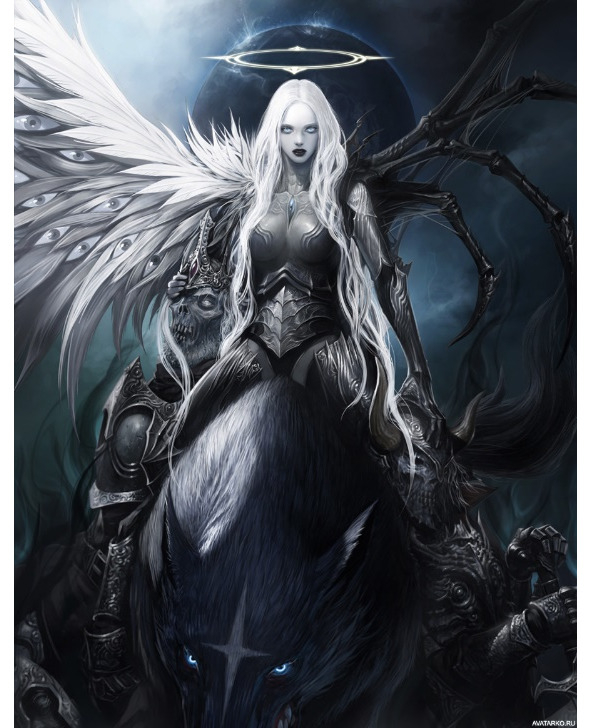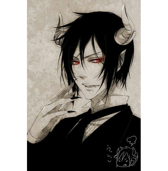 Передо мной стоял залитый кровью монстр. Демон махнул рукой, вмиг убрав кровь с лица. Высокое стройное тело, длинные черные когти, белые пепельные волосы по колено, черные завитые назад рога, тонкий черный хвост, черное, покрытое кожей, левое крыло из костей без перьев и белое правое.