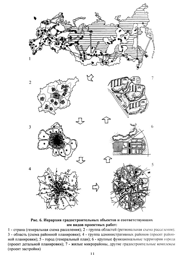 Иерархия градостроительных объектов и видов научно -проектных работ по градостроительству представляет собой систему разделения территории на различные единицы, объекты и проекты, которые имеют свои наименования, масштабы и функциональные назначения. В центре этой иерархии находится территориальная единица, которая может быть областью, крупным экономическим районом или регионом. Для каждой из этих единиц разрабатывается генеральная схема расселения на территории Российской Федерации, которая имеет масштаб 1:5000000.